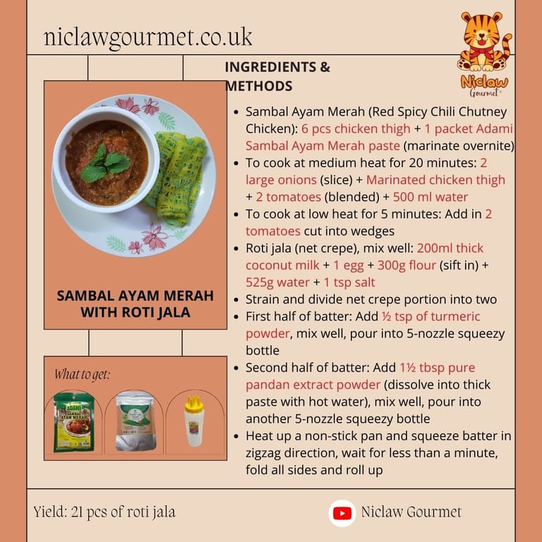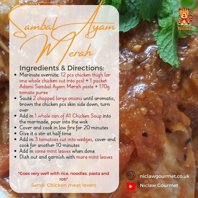 Heat up 200g cooking oil. Sauté sliced onion and leaves until fragrant. Add whole packet of sambal ayam merah paste, 600ml water and 170g tomato sauce. When gravy starts boiling, add fried chicken pieces and quartered tomatoes. Cook for 20 minutes or until meat becomes tender. Serve with ghee rice or plain white rice.