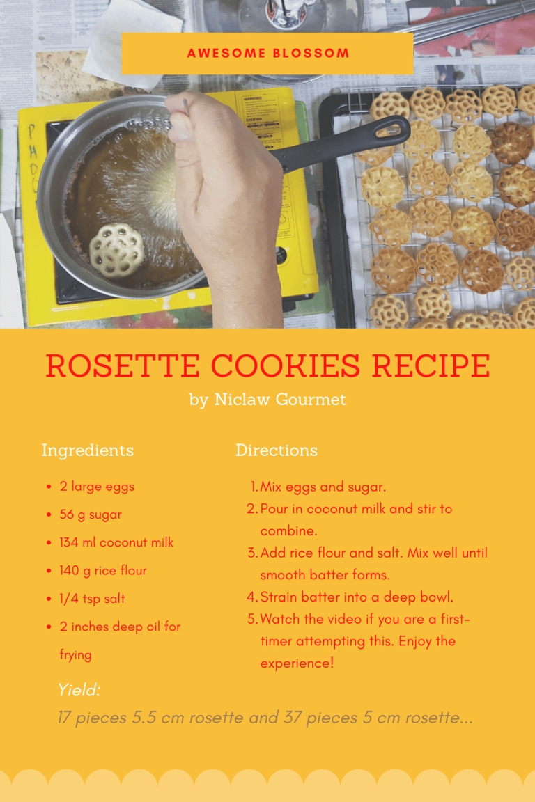 Heat up 4 rosette moulds in hot oil. When thoroughly heated, dip 1st mould in batter up to 4/5 of mould height (not up to top). Hold mould in hot oil, not letting the mould touch the base of wok/pan. When rosette cookie is released, let the 1st mould rest in hot oil. Take the 2nd mould and dip in batter. When cookie is released from mould, let the 2nd mould rest in hot oil. Repeat