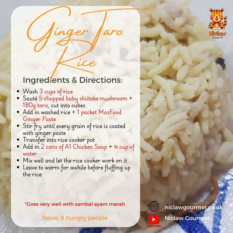 1. Put in 500gm washed rice with 500gm water into rice cooker. Add in the Masfood Ginger All Purpose Paste to stir it and start cooking. (if can, put in 2 pandan leaf. It will more delicious.)