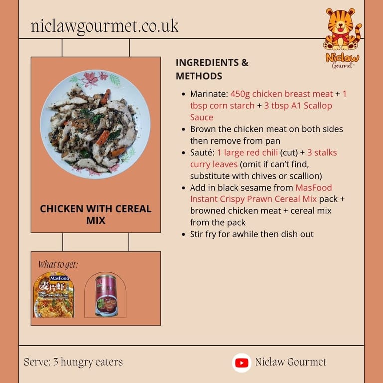 2. Discard oil, clean wok. Over low heat, add 1 tbsp butter. Add chilli padi and curry leaves. Stir-fry till fragrant. Add prawns, Masfood mixed seasoning and cereal. Mix well. Serve hot with rice.