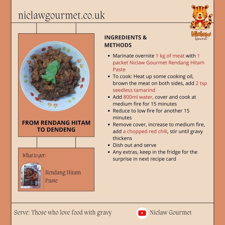 Add 800g-1kg of meat, chicken, or seafood and up to 500ml of water (add a little at a time) with a packet of rendang paste. Cook until half dried and ready to serve. No need to saute the paste. Kerisik optional.