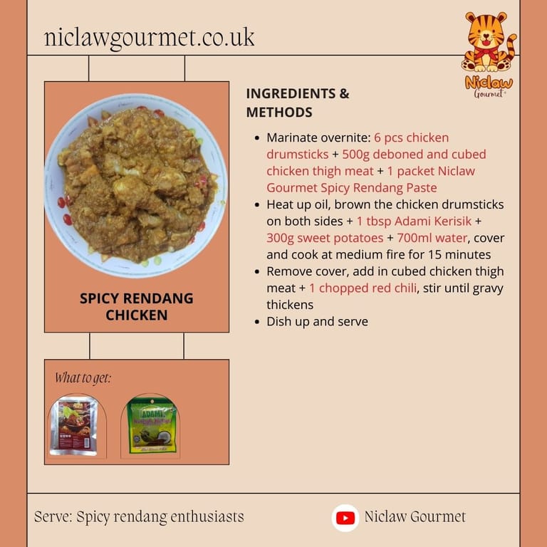 Add 800g-1kg meat, chicken, or seafood and up to 500ml of water (add a little at a time) with a packet of spicy rendang paste. Cook until half dried and ready to serve. No need to saute the paste. Kerisik optional.